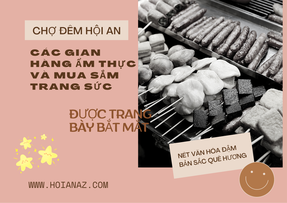 Những người bán hàng rong ở khu chợ này chuyên bán nhiều món đặc sản của Hội An và Quảng Nam. Cụ thể, bạn có thể chọn cho mình một số món ăn ngon như mì quảng, hến cuốn lá lốt, cao liu, bắp nướng, ...