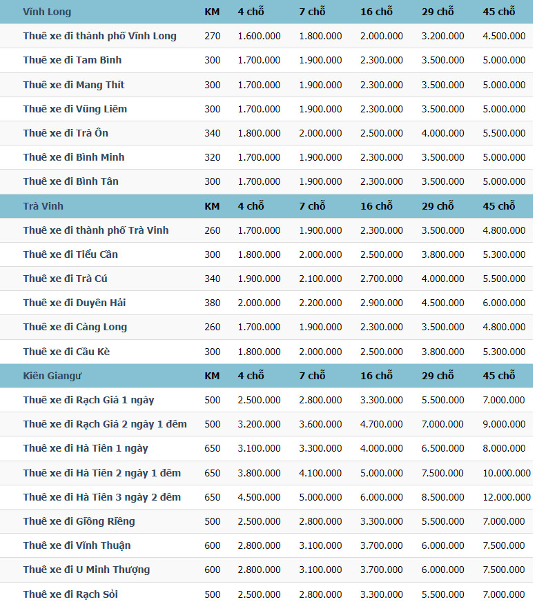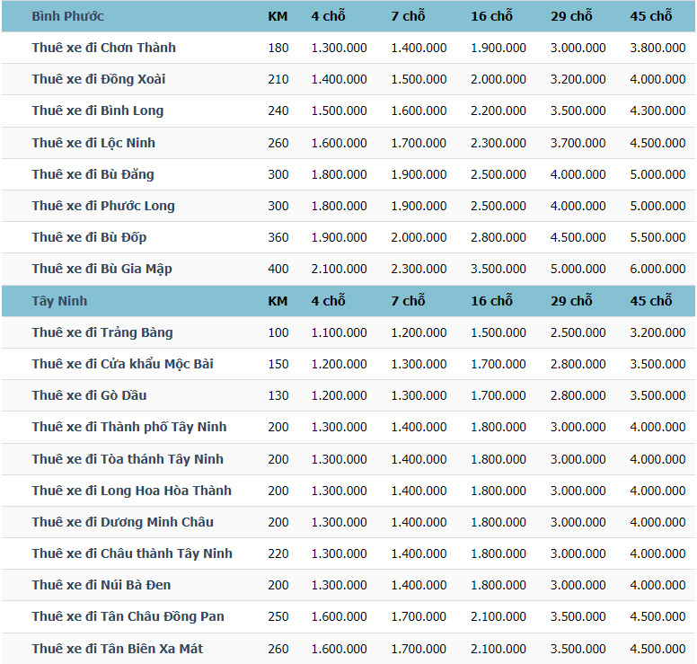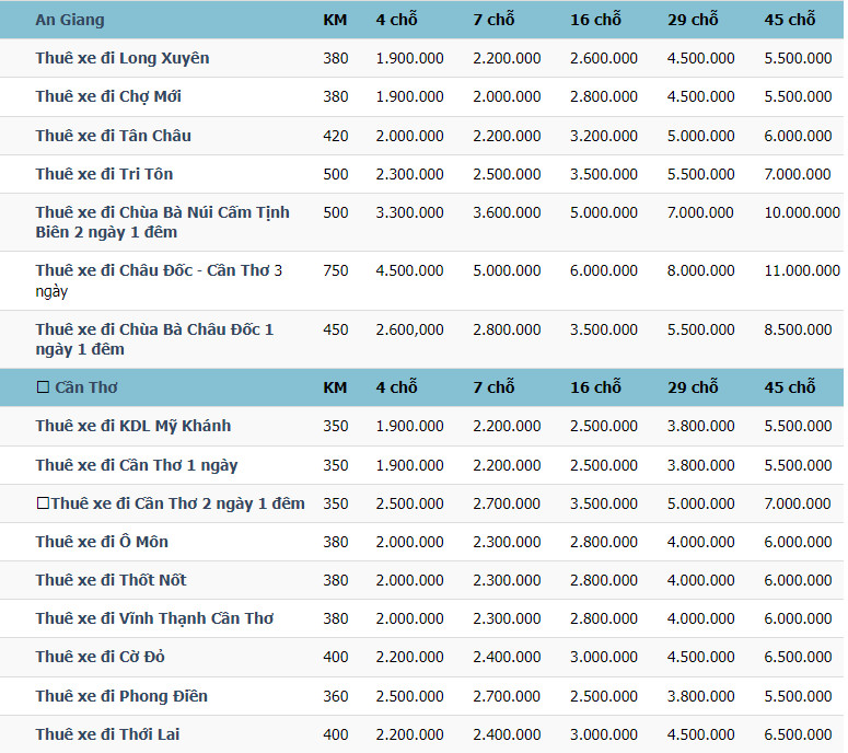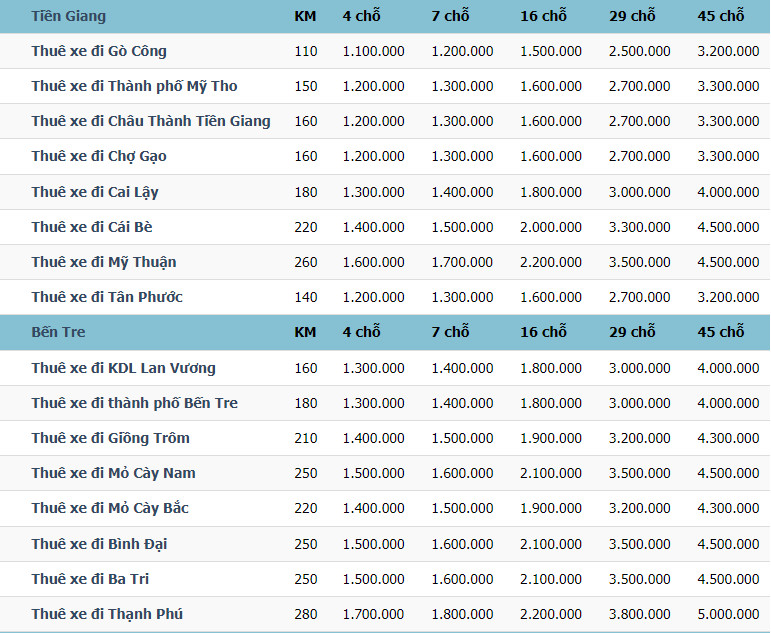 Bảng giá giá thuê xe du lịch tại TP HCM