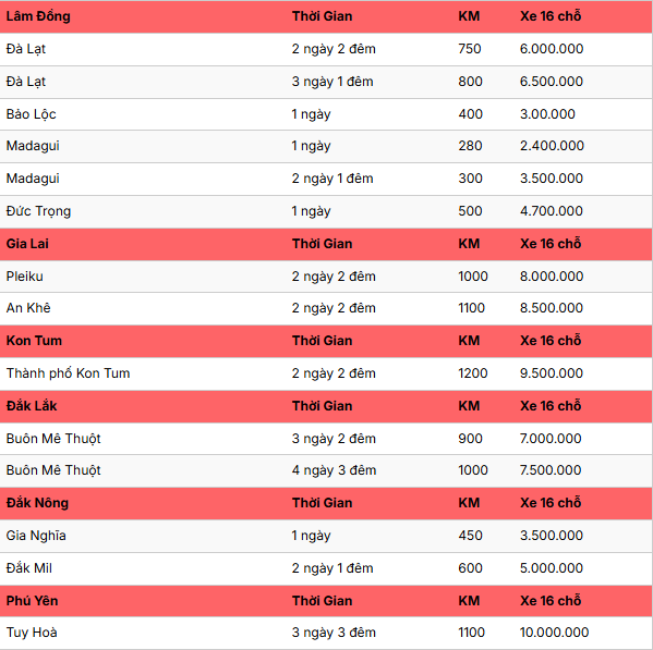 BẢNG GIÁ THUÊ XE 16 CHỖ